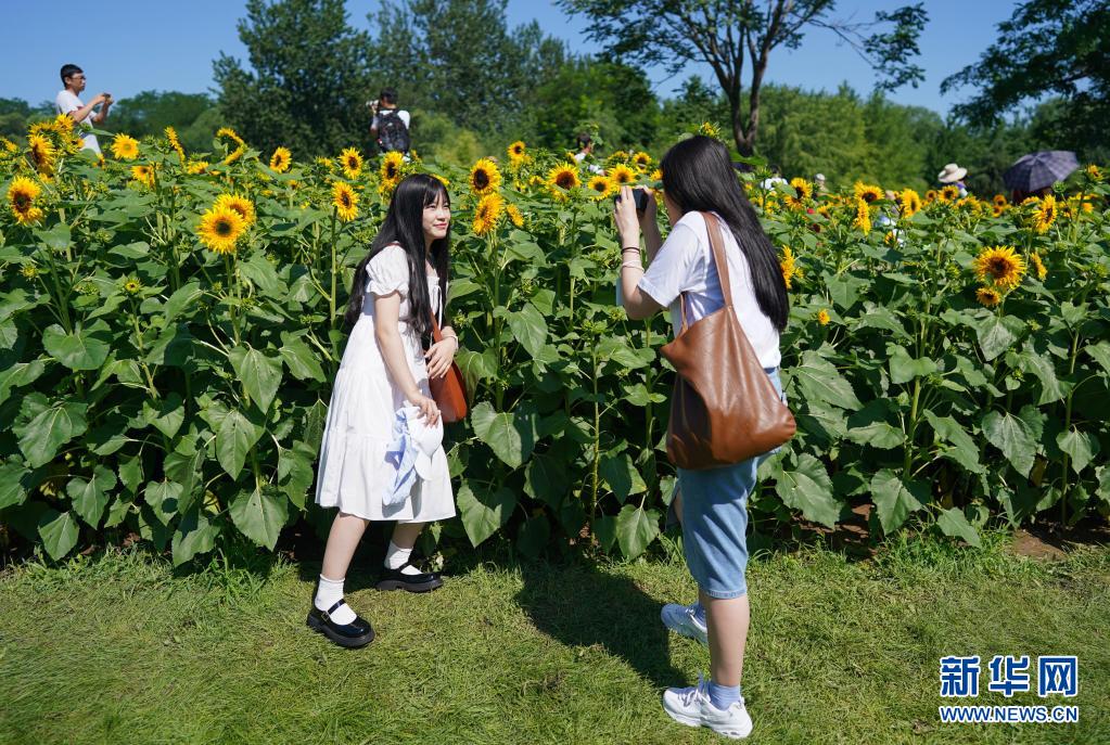 7月4日,游客在北京奧林匹克森林公園北園的向日葵花田旁拍照。