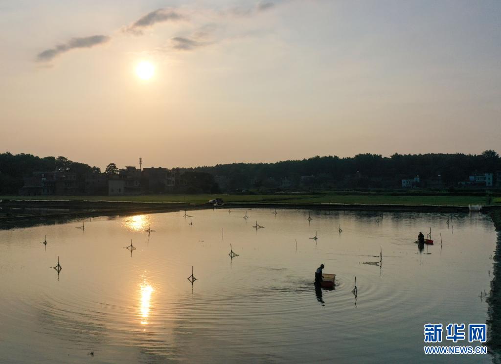7月5日,在湖南省永州市道縣蚣壩鎮(zhèn)洲背村,村民在收獲小龍蝦(無人機照片)。