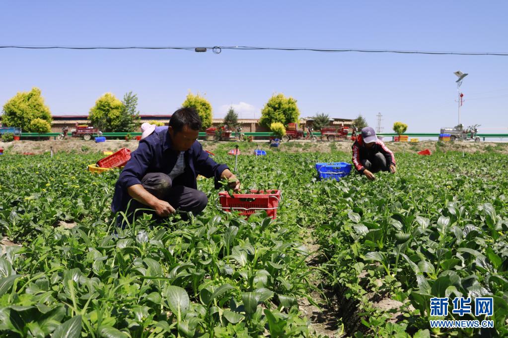 7月4日,在甘肅省張掖市甘州區(qū)烏江鎮(zhèn)供港蔬菜基地,當(dāng)?shù)厝罕娫诓烧卟恕?/p>