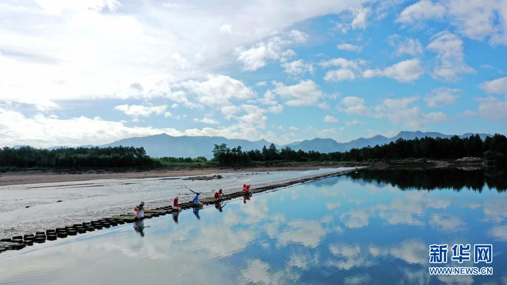 當(dāng)日,浙江省臺州市仙居縣永安溪流域水面如鏡,藍(lán)天、白云倒影水中,構(gòu)成一幅美麗的畫卷。新華社發(fā)(王華斌 攝)