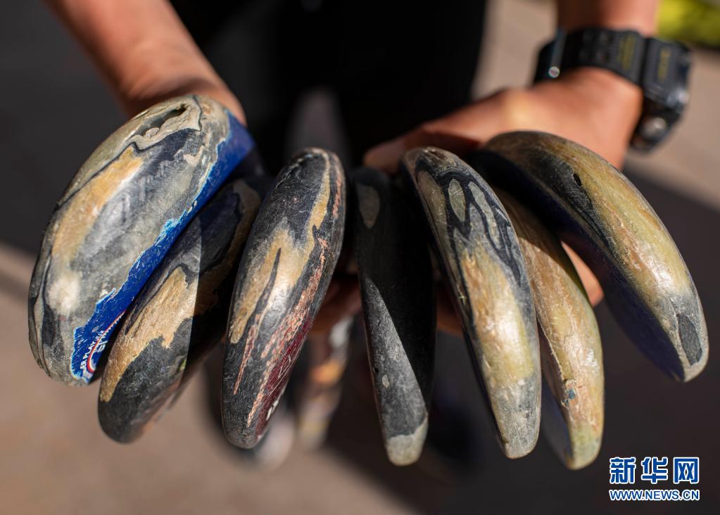訓(xùn)練結(jié)束后,教練杜寶柱在收納小隊(duì)員們訓(xùn)練時(shí)使用的球棍(6月12日攝)。