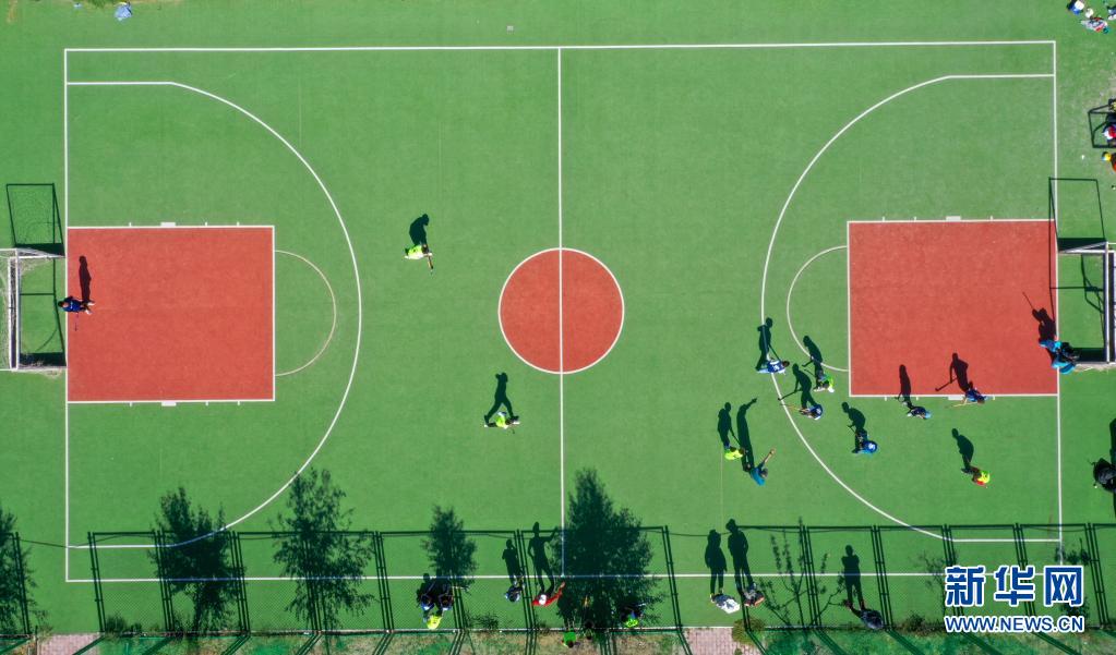 塔城市第二小學(xué)曲棍球隊的小隊員利用周末時間進(jìn)行練習(xí)(6月12日攝,無人機(jī)照片)。