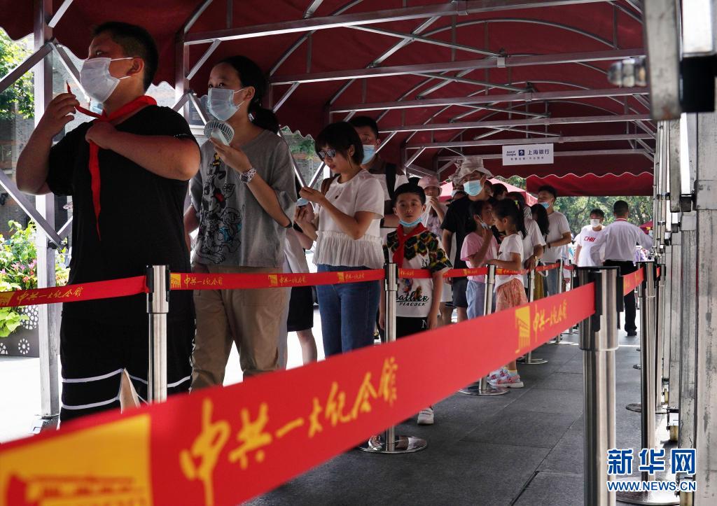 7月11日,觀眾在中共一大紀(jì)念館前的遮陽(yáng)棚下排隊(duì)等待參觀。
