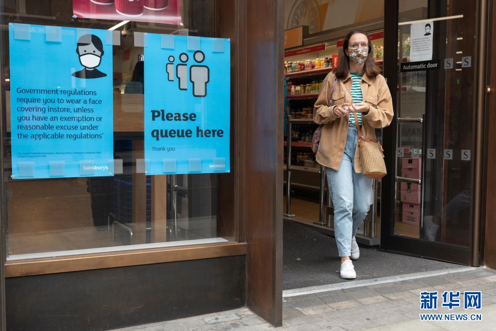7月12日,一名戴口罩的女子走出英國(guó)倫敦一家超市。