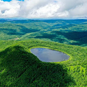 這是7月14日拍攝的阿爾山國家森林公園內(nèi)的天池(無人機(jī)照片)。