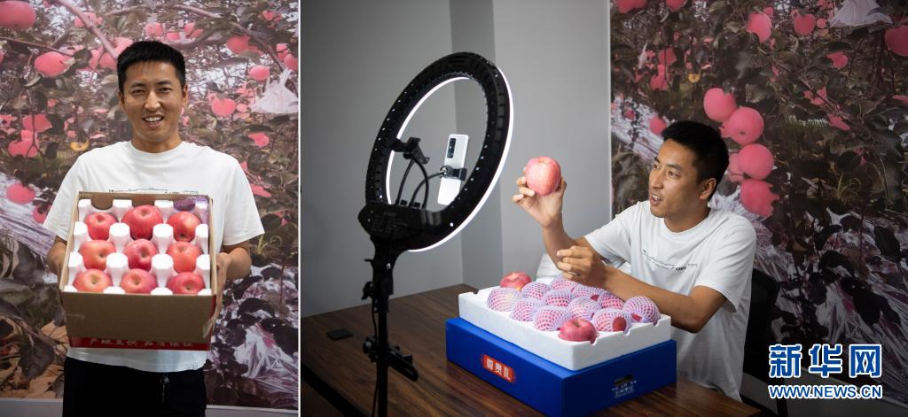 拼版照片:左圖為郭鋒杰展示山西省吉縣產(chǎn)的蘋果;右圖為郭鋒杰通過(guò)網(wǎng)絡(luò)直播銷售蘋果(7月9日攝)。今年32歲的郭鋒杰是吉縣古賢村人,常年在外從事建筑行業(yè)。吉縣有“蘋果之鄉(xiāng)”的美譽(yù),看到吉縣蘋果在農(nóng)村電商領(lǐng)域的發(fā)展?jié)摿?,郭鋒杰經(jīng)過(guò)長(zhǎng)期考察后,選擇返鄉(xiāng)創(chuàng)業(yè)。返鄉(xiāng)后,他忙著和果農(nóng)洽談合作,聯(lián)系各大商超,自己也開起了網(wǎng)店,做起了“主播”。