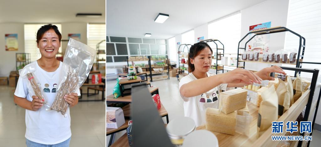 拼版照片:左圖為楊王芳在展示山西省平順縣產(chǎn)的黨參;右圖為楊王芳在平順縣龍鎮(zhèn)村電商服務(wù)中心整理貨架(7月8日攝)。近年來,平順縣大力發(fā)展電子商務(wù),開展直播培訓、孵化、就業(yè)指導等,努力培養(yǎng)農(nóng)村電商人才。2019年初,一直在外打工的楊王芳得知村里發(fā)展電子商務(wù),覺得前景廣闊,回到村里加入電商隊伍。隨著電商飛速發(fā)展,龍鎮(zhèn)村搭上了“數(shù)字快車”,村里的農(nóng)副產(chǎn)品供不應(yīng)求,黨參、松花粉、小雜糧等成為熱賣產(chǎn)品。