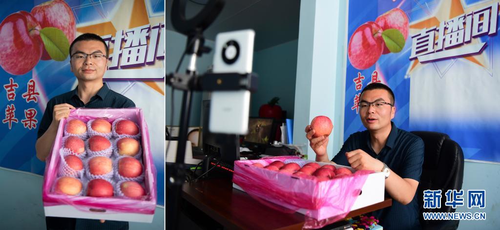 拼版照片:左圖為郭豐瑞展示山西省吉縣產(chǎn)的蘋果;右圖為郭豐瑞通過網(wǎng)絡直播介紹蘋果(7月9日攝)。今年31歲的郭豐瑞是吉縣南村人,曾在北京打工的他看到農(nóng)村電商的巨大潛力后,于2013年返鄉(xiāng)創(chuàng)業(yè)。2014年,郭豐瑞成立了合作社,同時開始線上銷售蘋果。隨著網(wǎng)絡直播熱潮的興起,郭豐瑞開始通過各個直播平臺宣傳家鄉(xiāng)的優(yōu)質蘋果。