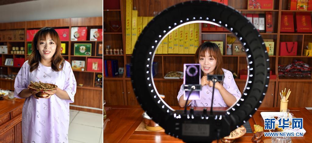 拼版照片:左圖為楊亞飛展示山西省平順縣產(chǎn)的黨參;右圖為楊亞飛通過(guò)網(wǎng)絡(luò)直播介紹黨參(7月9日攝)。今年31歲的楊亞飛是平順縣白家莊村人,2013年,懷著發(fā)展電子商務(wù)的夢(mèng)想,楊亞飛回到家鄉(xiāng)做起了電商。從只有幾件商品,到上線100多種農(nóng)副產(chǎn)品,楊亞飛創(chuàng)辦的網(wǎng)店從無(wú)到有,逐漸壯大。借助網(wǎng)絡(luò)的力量,楊亞飛銷售的核桃、花椒、黨參、柿餅、黑棗等當(dāng)?shù)赝撂禺a(chǎn)賣到了全國(guó)各地。