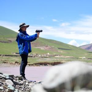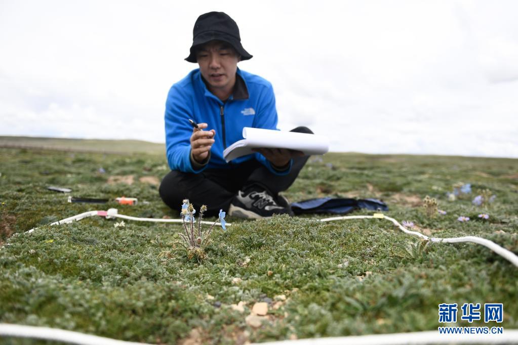 2021年長江源綜合科考的科考隊(duì)員任斐鵬在長江南源當(dāng)曲地區(qū)觀察高寒草甸(7月23日攝)。