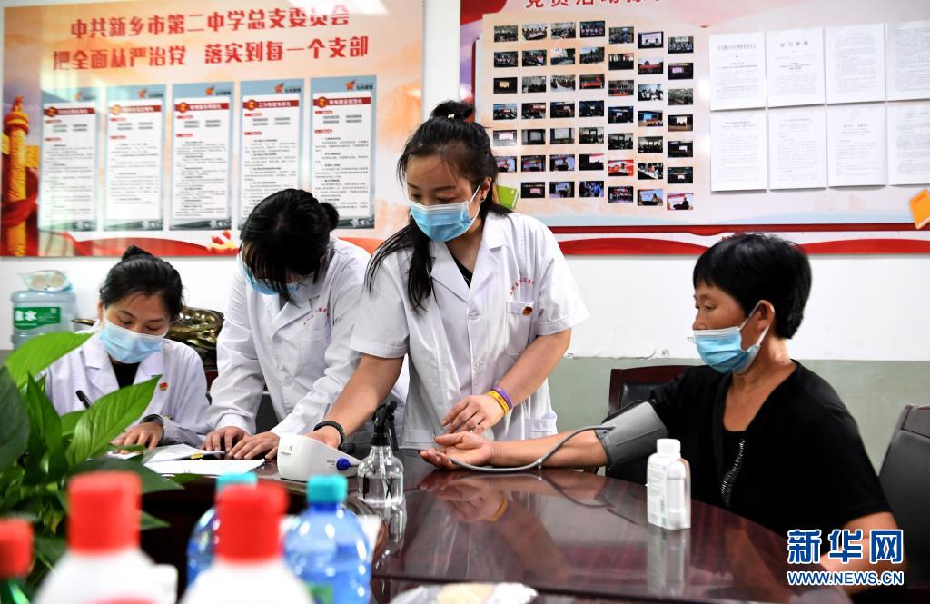 7月25日,醫(yī)護人員在河南省新鄉(xiāng)市第二中學(xué)臨時醫(yī)療救助點為轉(zhuǎn)移村民測量血壓。