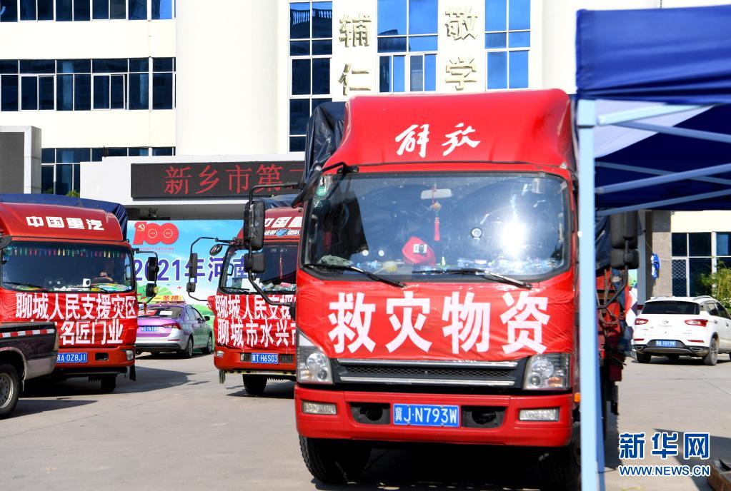 這是7月25日在河南省新鄉(xiāng)市第二中學(xué)安置點拍攝的物資運(yùn)輸車輛。