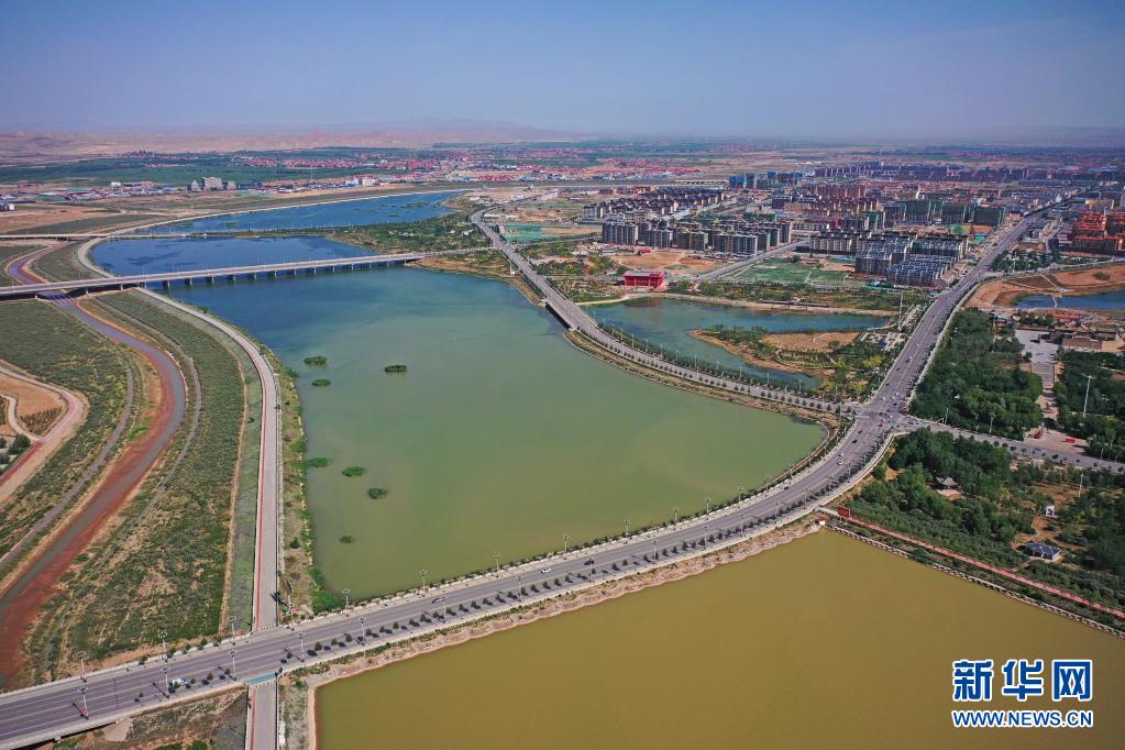環(huán)繞著寧夏吳忠市同心縣縣城的清水河水系(6月22日攝,無人機照片)。新華社記者 王鵬 攝