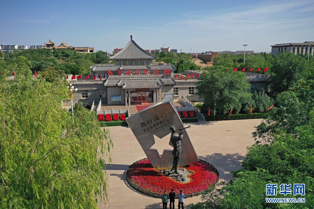 寧夏吳忠市同心縣紅軍西征紀念館前的“抗戰(zhàn)之聲”小號手雕塑(6月22日攝,無人機照片)。新華社記者 王鵬 攝