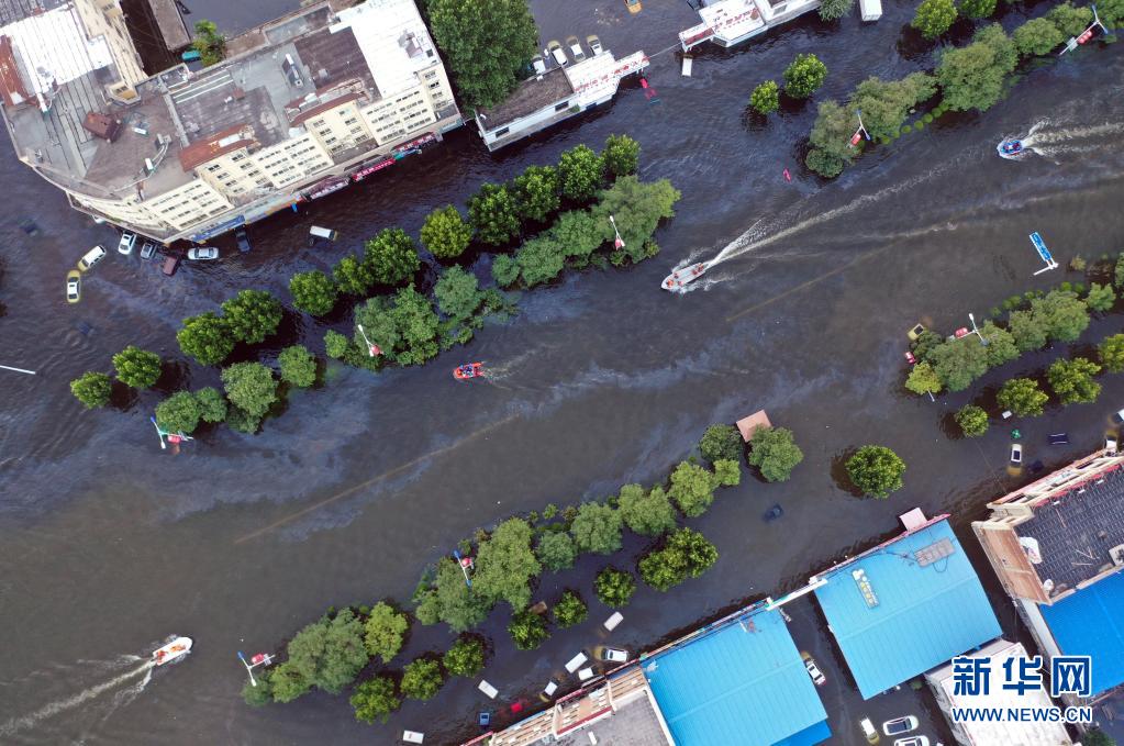 7月26日,在河南省衛(wèi)輝市,救援船只穿梭于城區(qū)內(nèi)(無(wú)人機(jī)照片)。