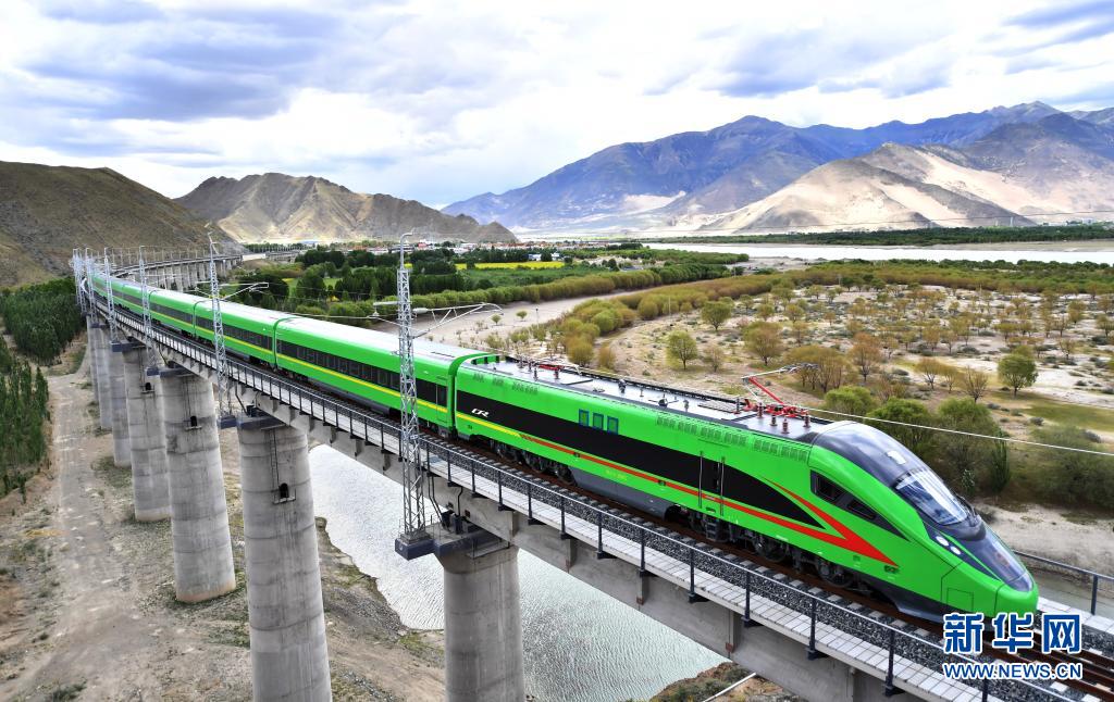這是6月16日拍攝的行駛在拉林鐵路上的復(fù)興號列車。