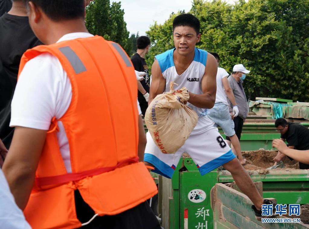 當(dāng)日,在河南省鶴壁市??h傅莊堤上,不少群眾自發(fā)前來和救援人員一起裝沙袋、運沙袋,共筑堤壩。受持續(xù)強降雨影響,??h防汛形勢嚴(yán)峻,傅莊堤主要為浚縣縣城及26個村莊提供保護。新華社記者 李安 攝