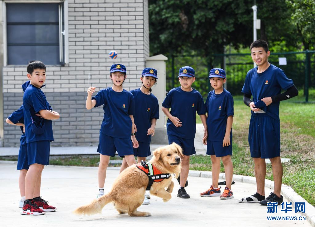 在四川省森林消防總隊特勤大隊,孩子們和搜救犬“麒麟”互動(7月27日攝)。