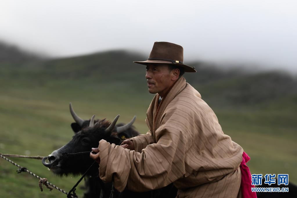 8月3日,在瑪沁縣當(dāng)洛鄉(xiāng)貢龍村的夏季草場(chǎng)上,牧民在拴牦牛。
