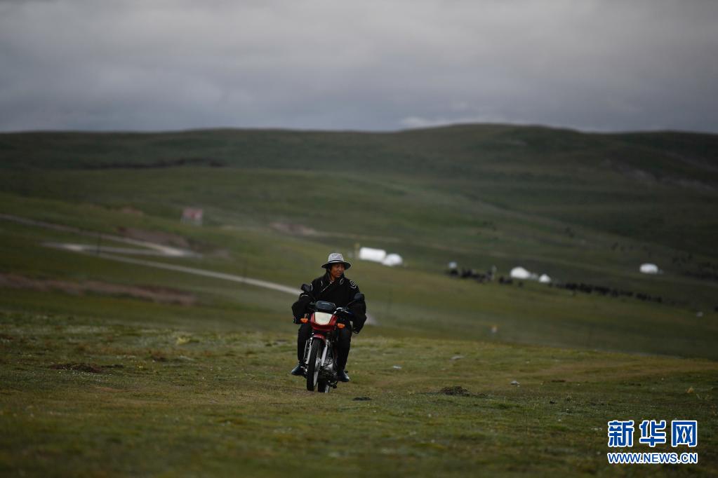 8月3日,在瑪沁縣當(dāng)洛鄉(xiāng)貢龍村的夏季草場上,牧民騎著摩托車在查看牛羊。