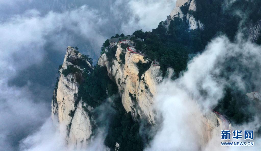 8月14日,奇景幻影的西岳華山東峰一景(無(wú)人機(jī)照片)。