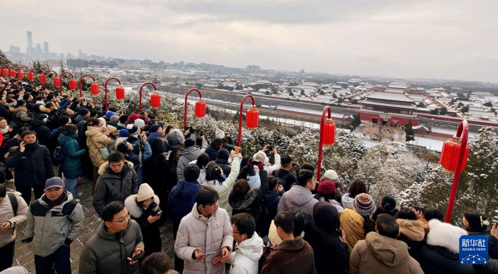 1月18日,人们在北京景山公园观赏、拍摄故宫雪景。