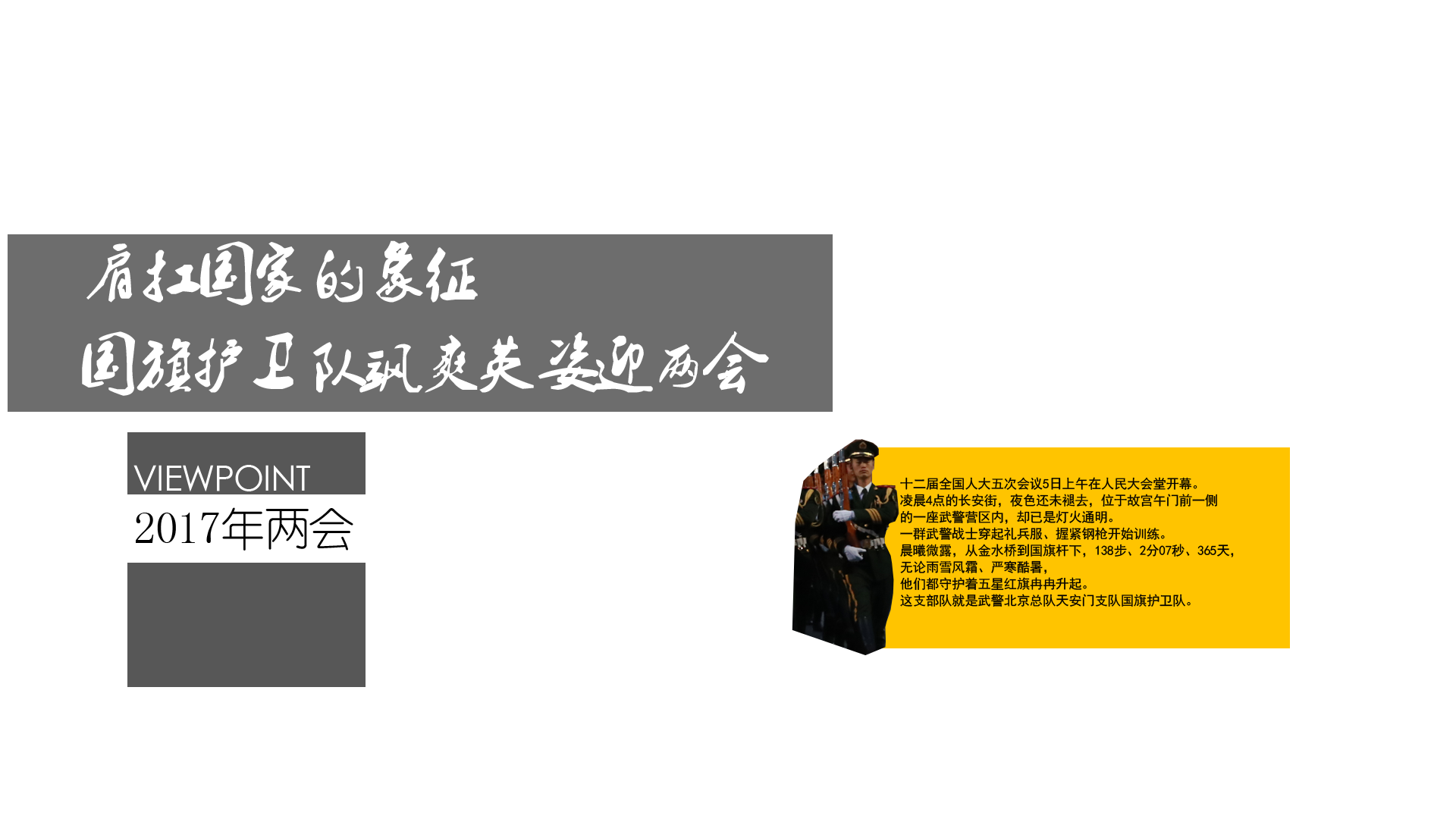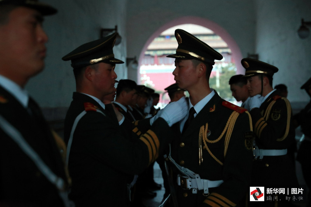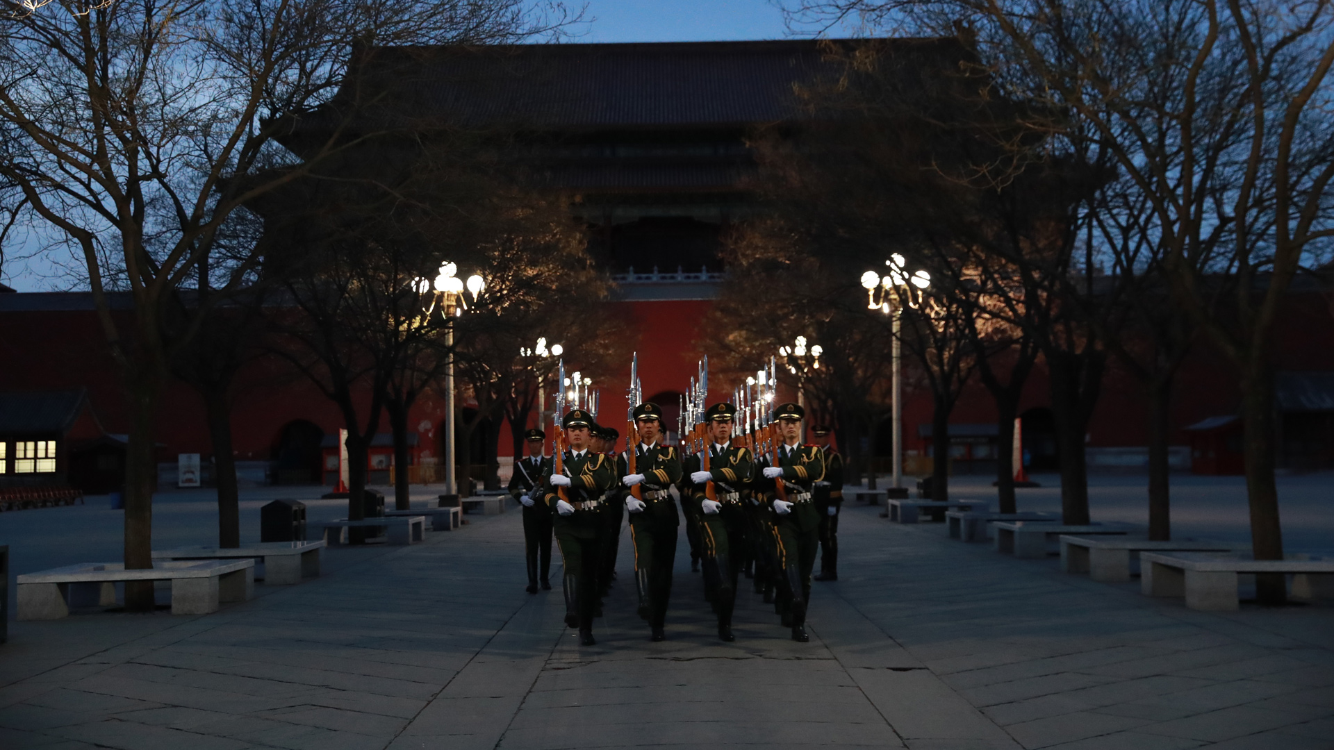 2017年3月5日,第十二屆全國人民代表大會第五次會議在人民大會堂開幕。凌晨4點的長安街,夜色還未褪去,位于故宮午門前一側(cè)的一座武警營區(qū)內(nèi),卻已是燈火通明。一群武警戰(zhàn)士穿起禮兵服、握緊鋼槍開始訓(xùn)練。晨曦微露,從金水橋到國旗桿下,138步、2分07秒、365天,無論雨雪風霜、嚴寒酷暑,他們都守護著五星紅旗冉冉升起。這支部隊就是武警北京總隊天安門支隊國旗護衛(wèi)隊。