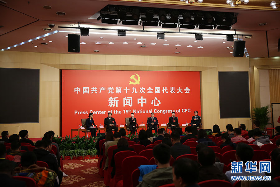 ??? 10月19日,十九大新聞中心舉辦集體采訪,邀請(qǐng)政法戰(zhàn)線代表談全面推進(jìn)依法治國(guó)。圖為采訪現(xiàn)場(chǎng)。新華網(wǎng) 郝廣鵬攝
