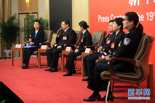 ??? 10月19日,十九大新聞中心舉辦集體采訪,邀請政法戰(zhàn)線代表談推進(jìn)全面依法治國。圖為采訪現(xiàn)場。新華網(wǎng) 郝廣鵬攝