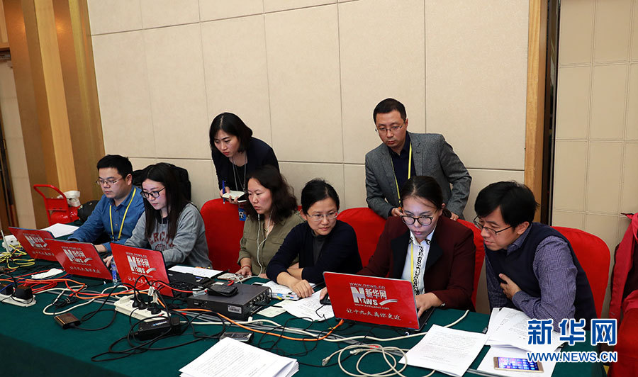 ??? 10月20日,十九大新聞中心舉辦集體采訪活動(dòng),主題為“實(shí)施創(chuàng)新驅(qū)動(dòng)發(fā)展戰(zhàn)略”。圖為新華網(wǎng)在現(xiàn)場直播。新華網(wǎng) 郝廣鵬攝