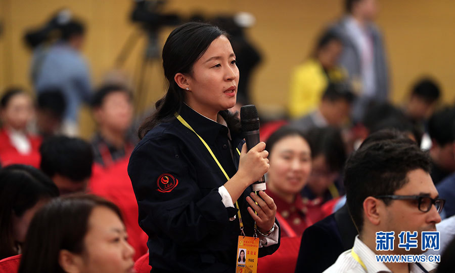 ??? 10月20日,十九大新聞中心舉辦集體采訪活動,主題為“實(shí)施創(chuàng)新驅(qū)動發(fā)展戰(zhàn)略”。圖為人民網(wǎng)記者提問。新華網(wǎng) 郝廣鵬攝