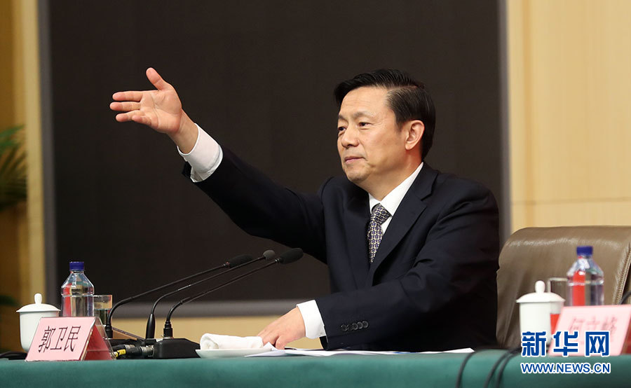 10月21日,十九大新聞中心舉辦記者招待會,邀請國家發(fā)展改革委黨組書記、主任何立峰,副主任張勇,副主任寧吉喆介紹以新發(fā)展理念為引領(lǐng),推進(jìn)中國經(jīng)濟(jì)平穩(wěn)健康可持續(xù)發(fā)展有關(guān)情況,并回答記者提問。圖為主持人郭衛(wèi)民。新華網(wǎng) 郝廣鵬攝