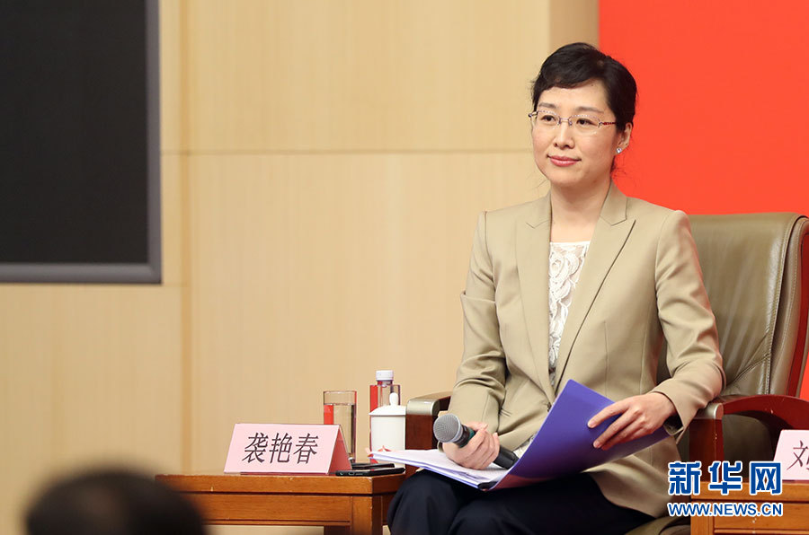 10月22日,十九大新聞中心在梅地亞中心二層新聞發(fā)布廳舉辦集體采訪活動,主題為“中國特色強(qiáng)軍之路邁出堅(jiān)定步伐”。圖為主持人襲艷春。新華網(wǎng) 郝廣鵬攝