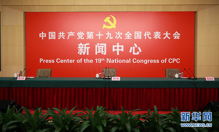 10月23日,十九大新聞中心舉辦記者招待會,邀請中央財經領導小組辦公室副主任楊偉民,環(huán)境保護部黨組書記、部長李干杰介紹踐行綠色發(fā)展理念,建設美麗中國有關情況,并回答記者提問。圖為記者招待會現場。新華網 郝廣鵬攝