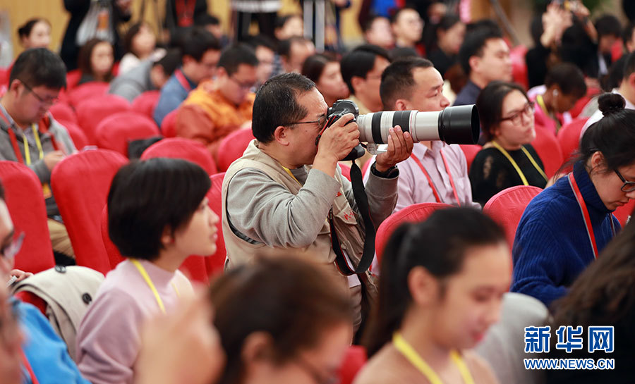 10月23日,十九大新聞中心舉辦集體采訪活動(dòng),主題為“打好生態(tài)環(huán)保攻堅(jiān)戰(zhàn)”。圖為現(xiàn)場(chǎng)記者。新華網(wǎng) 郝廣鵬攝