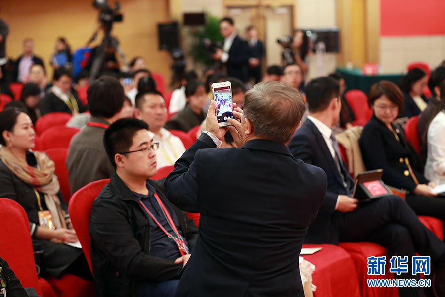 10月23日,十九大新聞中心舉辦集體采訪活動(dòng),主題為“打好生態(tài)環(huán)保攻堅(jiān)戰(zhàn)”。圖為現(xiàn)場記者。新華網(wǎng) 郝廣鵬攝