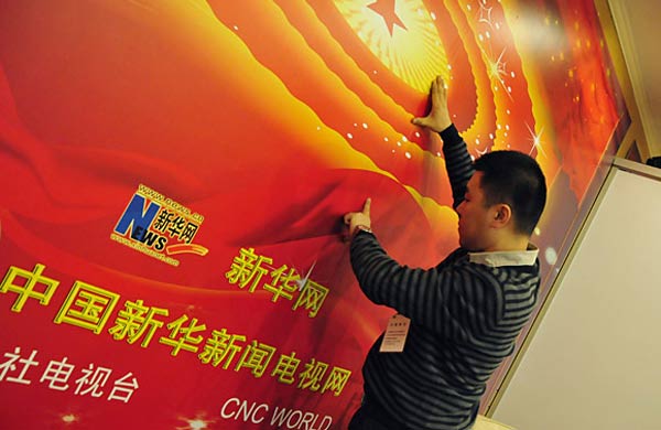 3月1日,新華網(wǎng)兩會報道人員正在布置工作間。第十一屆全國人民代表大會第四次會議、全國政協(xié)十一屆四次會議即將開幕。