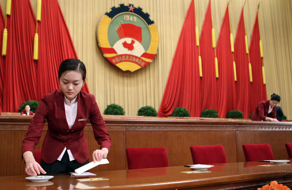 3月3日,人民大會堂的工作人員在布置會場。當(dāng)日15時,中國人民政治協(xié)商會議第十一屆全國委員會第四次會議將在北京人民大會堂開幕。