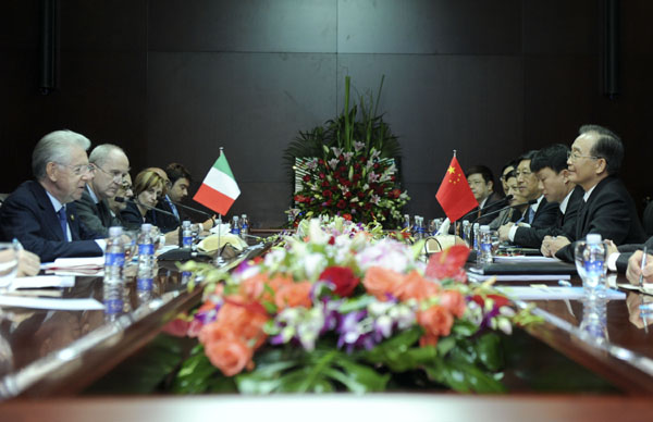 ??? 11月5日,中國(guó)國(guó)務(wù)院總理溫家寶在老撾首都萬(wàn)象會(huì)見(jiàn)出席第九屆亞歐首腦會(huì)議的意大利總理蒙蒂。 新華社記者張鐸攝