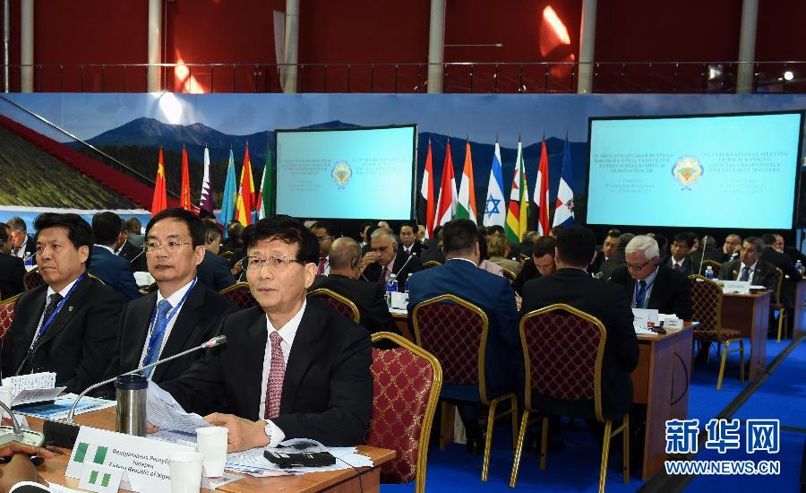 ??? 6月25日,中共中央政治局委員、中央政法委書記孟建柱(前右)出席在俄羅斯烏蘭烏德舉行的第六屆安全事務(wù)高級(jí)代表國(guó)際會(huì)議。中共中央政治局委員、中央政法委書記孟建柱24日至25日出席在俄羅斯烏蘭烏德舉行的第六屆安全事務(wù)高級(jí)代表國(guó)際會(huì)議。來自近70個(gè)國(guó)家和國(guó)際組織的代表圍繞加強(qiáng)國(guó)際協(xié)作,共同打擊極端勢(shì)力和恐怖主義進(jìn)行深入討論,達(dá)成重要共識(shí)。新華社記者賈宇辰攝