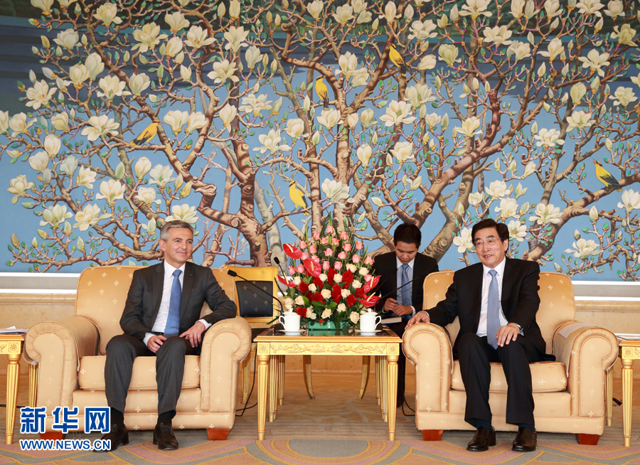 ??? 7月14日,中共中央政治局委員、北京市委書記郭金龍?jiān)诒本婑R耳他國民黨領(lǐng)袖布蘇蒂爾。 新華社記者 丁海濤 攝