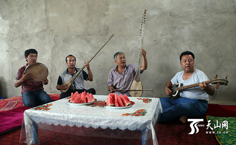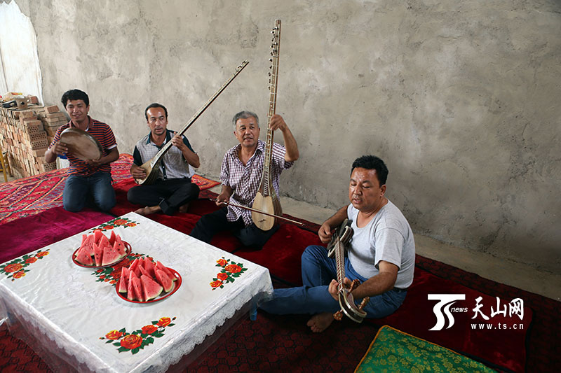 2013年以來,鄯善縣拿出資金,在全縣每個自然村建立農(nóng)民“文化大院”,給農(nóng)民提供文化娛樂的場所,十二木卡姆也自然成為大院里必備的節(jié)目,老藝人們忙碌了不少。最近正值齋月期間,村民間的文化活動照舊開展,蘇來曼 阿不都時常還要去周圍村里演出,最讓他高興的是,十二木卡姆這門古老的藝術(shù),在今天依舊被大家重視和喜愛,這一點對于他來說,比金錢更重要?!爸灰蠹疫€喜歡十二木卡姆,在平日里能見到它,它的傳承和發(fā)展就有不竭動力?!?蘇來曼 阿不都說。