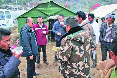 王海(左三)在吉隆鎮(zhèn)災(zāi)區(qū)布置工作。資料照片