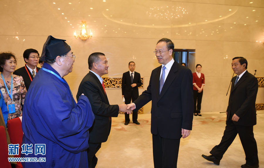 ?? 9月4日,紀(jì)念中國(guó)人民抗日戰(zhàn)爭(zhēng)暨世界反法西斯戰(zhàn)爭(zhēng)勝利70周年宗教界和平祈禱活動(dòng)在北京舉行。這是中共中央書記處書記、全國(guó)政協(xié)副主席杜青林,全國(guó)政協(xié)副主席齊續(xù)春會(huì)見參加和平祈禱活動(dòng)的宗教界代表。新華社記者 張領(lǐng) 攝