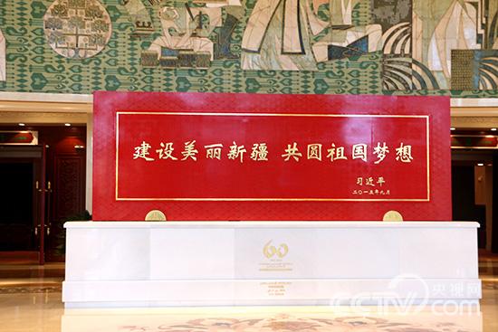 習(xí)近平總書記題詞“建設(shè)美麗新疆 共圓祖國夢想”的賀匾。