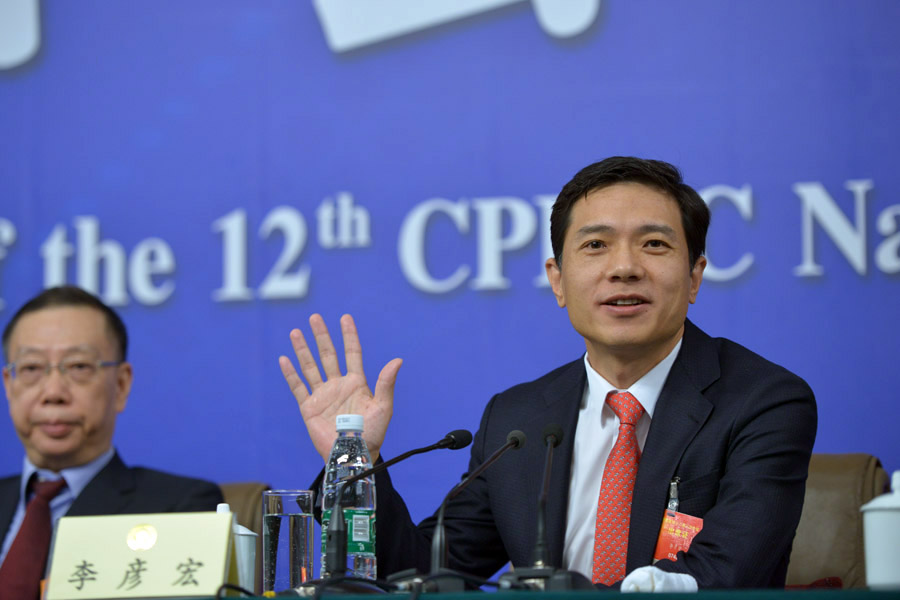 ??? 全國政協(xié)十二屆三次會(huì)議舉行記者會(huì),邀請全國政協(xié)常委朱維群、黃潔夫和全國政協(xié)委員胡曉義、李彥宏、俞敏洪等談促進(jìn)民生改善與社會(huì)和諧穩(wěn)定,并回答記者提問。圖為李彥宏答記者問。新華網(wǎng)/中國政府網(wǎng) 郭小天 攝