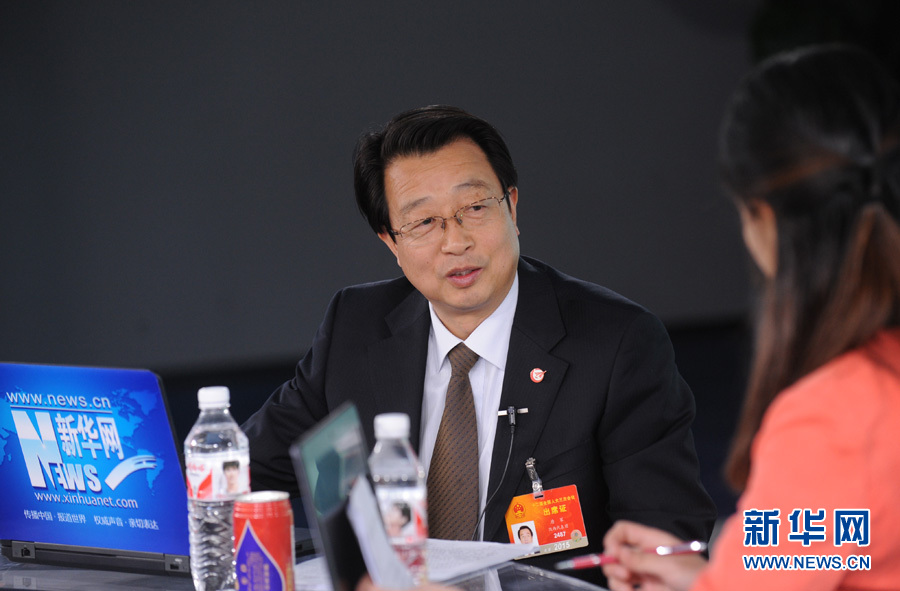 2015年3月13日,全國(guó)人大代表、中航飛機(jī)股份有限公司總經(jīng)理唐軍做客新華網(wǎng),就航空制造業(yè)面臨的機(jī)遇和挑戰(zhàn)與廣大網(wǎng)友展開交流。圖為唐軍與主持人交談。 新華網(wǎng) 陳競(jìng)超 攝
