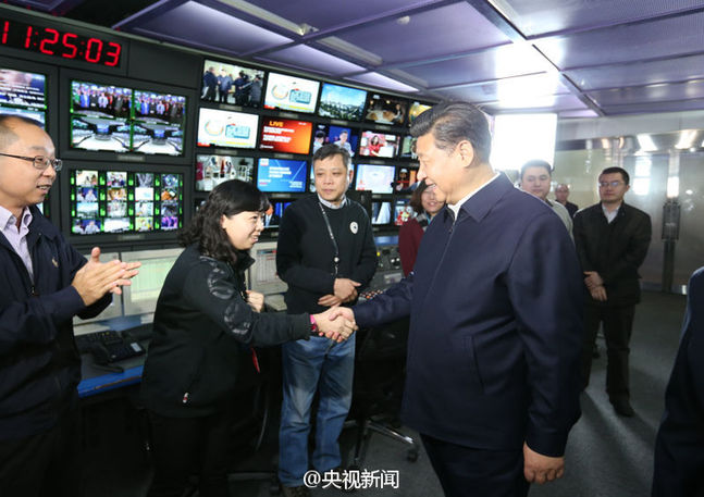 在總控中心,他同位于華盛頓市中心的北美分臺視頻連線,了解了分臺建設(shè)運(yùn)行情況。之后,習(xí)近平來到中央電視臺《新聞聯(lián)播》演播室、導(dǎo)播間,同編播團(tuán)隊(duì)互動交流。