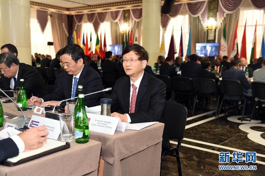 ??? 5月24日,在俄羅斯車臣共和國首府格羅茲尼,中共中央政治局委員、中央政法委書記孟建柱(前右一)在第七屆安全事務(wù)高級(jí)代表國際會(huì)議上發(fā)言。中共中央政治局委員、中央政法委書記孟建柱24日在俄羅斯車臣出席第七屆安全事務(wù)高級(jí)代表國際會(huì)議。來自70余個(gè)國家和國際組織的代表就深化國際安全合作、有效應(yīng)對恐怖主義等問題進(jìn)行探討。新華社發(fā)(郝帆攝)