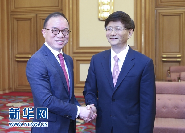 6月15日,中共中央政治局委員、中央政法委書記孟建柱在北京中南海會(huì)見香港特別行政區(qū)入境事務(wù)處處長曾國衛(wèi)。 新華社記者姚大偉攝